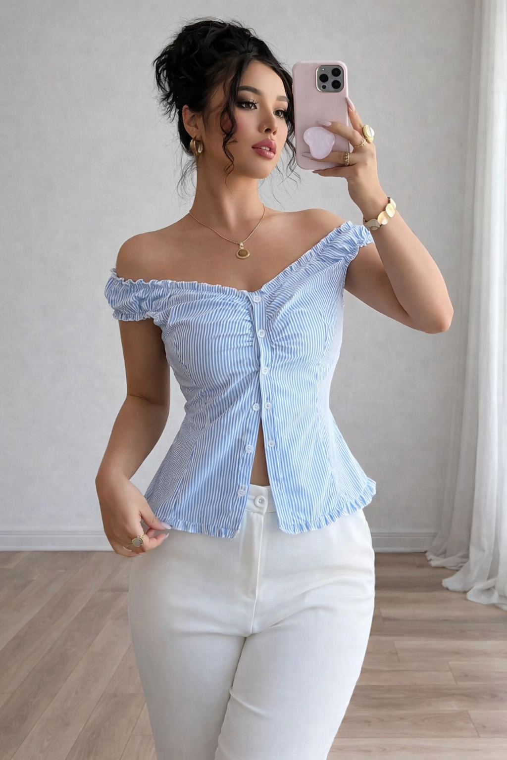 Blusa ajustada con botones, fruncida y elástica con rayas, estilo bohemio para mujer, primavera/verano